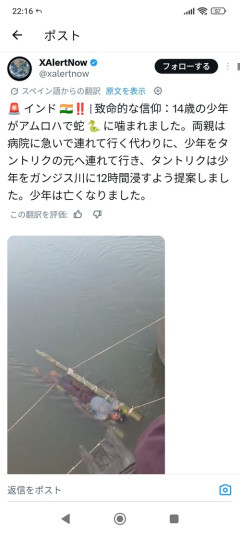 引用元: ・インド人「息子ヘビに噛まれたヨ」インド人「聖なるガンジス川に12時間漬ければ治るヨ」→結果 1: 以下、Zチャンネル@VIPがお送りします 2026/04/13(月) 11:48:06.90 ID:AKYggxK80 【速報】FANZAシコ同人 ~10円セール開催中っ👈🤩💥😭 ヒンディー語からの翻訳迷信…偽善はいつ終わるのか..蛇に噛まれた後に呪術と迷信のせいで無垢な命が失われた…!アムローアで14歳のアミットの命が奪われた..蛇に噛まれた後、家族は治療をさせる代わりに呪術を行わせた…!その後、毒を抜くためにガンジス川で棒で支えて吊るし下げられた..!およそ12時間後に水から引き上げられたが、無垢な子の息は止まっていた..今、家族は泣き叫んで惨めな状態だ..! अंधविश्वास...पाखंड कब खत्म होगा..सांप के डसने के बाद झाड़ फूंक और अंधविश्वास के चलते मासूम की मौत हो गई...!अमरोहा में 14 साल के अमित की जान चली गई..सांप के काटने के बाद परिजनों ने इलाज करवाने के बजाए झाड़ फूंक करवाई...!इसके बाद जहर उतारने के लिए उसे गंगा में डंडों के सहारे… pic.twitter.com/SqW6dtlxNI— Rahul Saini (@JtrahulSaini) April 11, 2026 ■おすすめ【画像】JKさん、おっぱいがエッチすぎる 【画像】人気巨乳グラドルさん、風俗バレか? 誰だよジュニアアイドルにここまで過激なことやらせた変態はよぉ!【悲報】また秋元康のとこのアイドル(AKB48?乃木坂46?)がAVデビュー【朗報】今月AVデビュー、当たりだらけ今度AVデビューする着エロのイメージビデオで乳首まで晒してた子が処女って肩書きで出演してるけど【悲報】アメリカのセクシー女優「日本のAVに出た結果www」【悲報】人気セクシー女優、こんな仕事までさせられる【悲報】自民党、もうメッチャクチャ【悲報】元AKB、またまたエチエチ世界へ堕ちる【画像】デカ乳JD、いいね欲しさにインスタにおっぱい画像をアップロード井上コーチが出演してたAV見たからレビューしてみた 【悲報】元AKBメンバー、お尻を丸出しにしてしまう 【悲報】昨日、加賀美シュナとのハメ撮り画像晒したなんJ民wwwwwww【画像】乳に全振りした女子高生wwwwwwwwwwwwwww【画像】陰キャ女ってこういう下着着けがちだよな【画像】中井りかのどエログラビアwwwwwwwwwwwww【悲報】現実を突きつけられたネトウヨ、発狂して碇シンジくんみたいになるこのセクシー女優の文章意味わからんのやが解読できる奴おる?【画像】橋本環奈さん、ガチでエロい…
