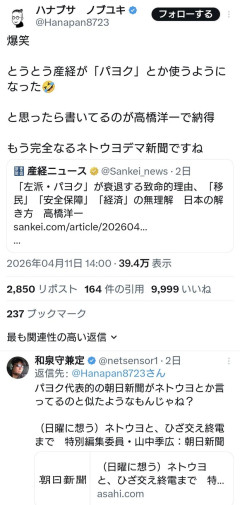 1:2026/04/13(月) 20:38:18.36 ID:alHKIhoU0産経ニュースの記事で『パヨク』という表現が使われたことを笑っていらっしゃいますが、朝日新聞では以前から『ネトウヨ』という言葉を記事タイトルや本文で普通に使用しています。例えば2015年の『ネトウヨと、ひざ交え終電まで』という記事などです。… — パニッシャー (@punisher007) April 12, 2026転載元スレッド:…