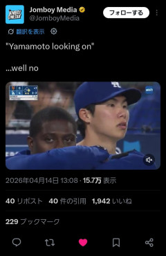 1: 名無し 2026/04/14(火) 17:10:59.785 ID:UGOkrKu3P ※"Yamamoto looking on"...well no pic.twitter.com/Oh2WZy2ab2— Jomboy Media (@JomboyMedia) April 14, 2026 2: 名無し 2026/04/14(火) 17:11:11.040 ID:UGOkrKu3P これは教育やろなぁ…