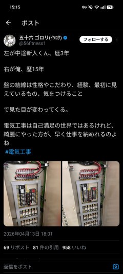 1: 2026/04/14(火) 15:18:24.30 左が中途新人くん、歴3年右が俺、歴15年盤の結線は性格やこだわり、経験、最初に見えているもの、気をつけることで見た目が変わってくる。電気工事は自己満足の世界ではあるけれど、綺麗にやった方が、早く仕事を納めれるのよね #電気工事 pic.twitter.com/Bb4PS3zOrB— 五十六 ゴロリ(イソロク) (@56fitness1) April 13, 2026 ※関連記事 【画像】この漫画の「ダメ人間」と付き合っている彼女の話、少し怖くて草wwwww…