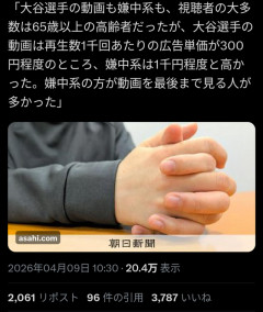2: 名無しさん@恐縮です 2026/04/13(月) 21:09:39.75 ID:bl+rfQIE0 これも朝日新聞の記事だけど また大谷ファンが高齢者だとバラされたな😂 >大谷選手の動画も嫌中系も、視聴者の大多数は65歳以上の高齢者だった >大谷選手の動画も嫌中系も、視聴者の大多数は65歳以上の高齢者だった 引用元:…