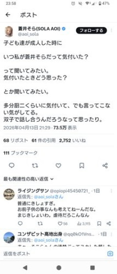 1: ネギ速の名無しさん 2026/04/14(火) 23:59:21.80 ID:OZ0KV3Qs0 imgur.com/WhRXcfG 2: ネギ速の名無しさん 2026/04/15(水) 00:03:51.82 ID:GjGaI0yH0 立ちバックでセッ◯スしたのを公表 imgur.com/BcOx2KM 3: ネギ速の名無しさん 2026/04/15(水) 00:10:19.66 ID:5QAzqULo0 アダビデ出まくってありとあらゆる変態プレーこなしてきたのになぜ不祥事芸能人とのワンナイトで炎上すんねんw…