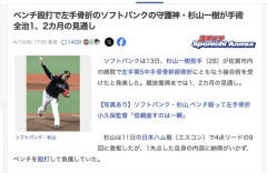 1 : ベンチ殴打で左手骨折のソフトバンクの守護神・杉山一樹が手術 全治1、2カ月の見通し(スポニチアネックス) - Yahoo!ニュース ソフトバンクは13日、杉山一樹投手(28)が佐賀市内の病院で左手第5中手骨骨幹部骨折にともなう接合術を受けたと発表した。競技復帰までは1、2カ月の見通し。 杉山は11日の日本ハム戦(エスコン)で4点リードの9回に登板したが、1失点した自身の内容に納得がいかず、ベンチを殴打して負傷していた。全文はソースで…