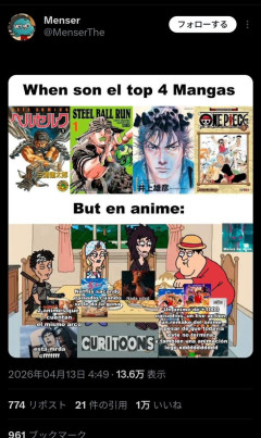 1: 名無しのアニゲーさん 2026/04/15(水) 17:24:47.763 ID:uhfuEcTrq 海外の漫画評価サイトのトップ4がベルセルク、ジョジョ7部、バガボンド、ワンピースらしい…