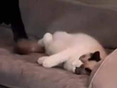 ベッドで横になっている猫さん。 こ、ここは僕の場所だワン。 困ったワンコはこんな感じ……