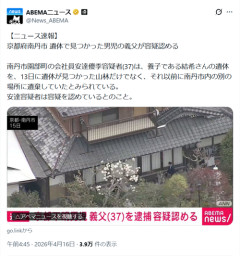 1: 2026/04/16(木) 03:36:00.34 【ニュース速報】京都府南丹市 遺体で見つかった男児の義父が容疑認める南丹市園部町の会社員安達優季容疑者(37)は、養子である結希さんの遺体を、13日に遺体が見つかった山林だけでなく、それ以前に南丹市内の別の場所に遺棄していたとみられている。安達容疑者は容疑を認めているとのこと。— ABEMAニュース (@News_ABEMA) April 15, 2026 ※関連記事 逮捕の父親は、安達優季容疑者37歳会社員…