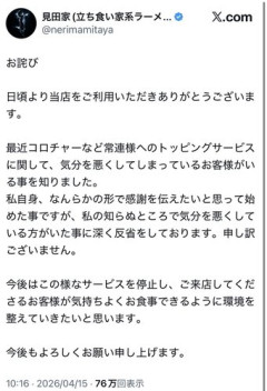 1: ネギ速の名無しさん 2026/04/16(木) 06:41:42.03 ID:y/T3/+Wi0 アイドルか?キャバクラか?常連なのにサービスされない奴からのクレーム1番デカイだろ新規客からクレームという引用ポストやリプばかり imgur.com/lUClJDv 2: ネギ速の名無しさん 2026/04/16(木) 06:45:03.80 ID:XY/cRsT50 内緒でやればいいもんやろそんなもん 3: ネギ速の名無しさん 2026/04/16(木) 06:43:19.41 ID:AdpW/AhL0 一見さんお断りのラーメン屋にすりゃいいじゃん…