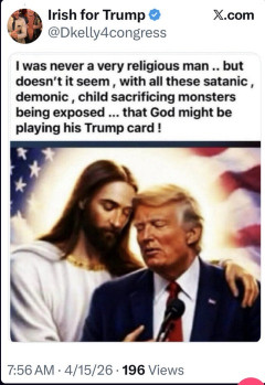 1 名前:少考さん ★:2026/04/16(木) 07:29:35.24 ID:rszCV8ru9.net 今度はキリストと並ぶ画像 トランプ氏「とても良い」 | NEWSjp -共同通信 Published 2026/04/16 06:33:50 【ワシントン共同】トランプ米大統領は15日、イエス・キリストと見られる人物と寄り添う画像を交流サイト(SNS)に投稿し「過激な左派は気に入らないかもしれないが、私はとても良いと思う」と書き込んだ。 (中略) トランプ氏が新たに載せた画像は、他人のX(旧ツイッター)の投稿を引用したもの。マイクの前に立つトランプ氏をキリストが斜め後方から抱き、目をつぶって額を合わせる様子で、背景には星条旗が描かれている。 トランプ氏は最近、イラン攻撃に批判的なローマ教皇レオ14世と対立した。 ※全文はソースで ※画像 ※関連スレ トランプ氏、キリスト姿の画像を投稿 保守派から批判相次ぎ削除 ★2 [少考さん★] トランプ大統領、ローマ教皇に謝罪拒否 「彼が間違っている」発言で対立激化 ★2 [ぐれ★] 引用元:…