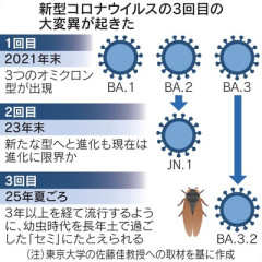 1: ななしさん@発達中 2026/04/16(木) 09:34:39.80 ● BE:866556825-PLT(21500)ID:t+6ECkqg0 新型コロナ「セミ」型に流行の兆し 3回目の大変異、日本で感染確認 2026年4月16日 5:00 新型コロナウイルスの変異型「BA.3.2(通称=セミ)」が世界で流行する兆しをみせている。2024年11月に南アフリカで初めて報告された当初は感染者数は増えなかった。26年に入り、日本など世界23カ国で事例が確認されている。 いったん潜伏した後、感染が拡大する様はセミの生態と似ており、通称はセミと名付けられた。セミは土の中で幼虫として数年間生息し、地上に現れる。…