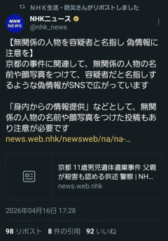 【悲報】NHK「無関係の人物を容疑者と名指しする偽情報に注意してください」