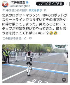 1:2026/04/17(金) 09:27:48.86 ID:0kavWKKf0北京的机器人马拉松,一个机器人竟被起跑线绊倒,当场摔得粉碎,可笑的是,工作人员居然抬着担架过来,不应该是拿筐和扫帚吗?🤣🤣 pic.twitter.com/Xc8soVYZEY— 作家崔成浩 (@cuichenghao) April 16, 2026転載元スレッド:…