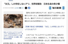 1 : 国内に生息する希少なアリが、女王アリしか存在しない種だと分かったと、森林総合研究所などの研究チームが発表した。働きアリやオスアリがおらず、女王だけのアリが報告されるのは世界初だという。 このアリは「キノムラヤドリムネボソアリ」。黄色がかったオレンジ色で、体長約3ミリ。アリ研究者として知られる元高校教諭の木野村恭一さんが、岐阜県内の里山で約40年前に発見した。現在まで約30例しか見つかっていない。 通常の女王アリは生涯に一度、オスと交尾する。その精子でたくさんの働きアリや新たな女王を産み、集団(コロニー)を作る。 しかしキノムラヤドリの女王は、似た大きさで別種の「ハヤシムネボソアリ」の女王を殺して自らその「女王」となり、コロニーを乗っ取る。こうした行動は「社会寄生」と呼ばれるが、キノムラヤドリにも働きアリやオスがいるのか、どうやって繁殖しているのかが分かっていなかった。 チームは、キノムラヤドリの女王が社会寄生したハヤシのコロニーを実験室で飼育。女王が交尾をせず子を産む「単為生殖」をしていることを突き止めた。産まれたのは女王アリだけだった。 続きは↓…