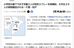 1 : 小学校の廊下で女子児童2人が防犯スプレーを誤噴射、6年生39人が病院搬送される…千葉・松戸(読売新聞オンライン) - Yahoo!ニュース 16日午前10時半頃、千葉県松戸市の市立上本郷小学校で、6年生の女子児童2人が防犯スプレーを誤って噴射し、6年生39人がせき込んだり、のどの痛みや気分の悪さを訴えたりして市内の病院に搬送された。いずれも入院の必要はなく、快方に向かっているという。 市教育委員会によると、女子児童2人は休み時間に教室前の廊下で、別の女子児童が自宅から持参した防犯スプレーを2回噴射した。児童3人はスプレーの用途を理解していなかったとみられる。全文はソースで…