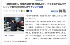 1 : 野蛮、ケンカからクリーンな闘い、競技へ。井上もまた、リング内外での振る舞いで、ボクシングのイメージを変えてきた。 「自分が求めているのは、子どもが『やりたい』と言ったときに、親がやらせられるスポーツ。そこがまず一番。今はドコモや大企業がスポンサーに付いてくれる。ボクシングのイメージが変わってきた証拠なのかなと思います」 ドコモやAmazonといった一流企業がスポンサーとなり、視聴形態はテレビから配信へと変わった。 豊富な資金力を背景に、これまで国内では不可能とされた強豪選手とのマッチメイクが実現し、井上は高額のファイトマネーを手にしている。 スポーツビジネス専門の米メディア、スポーティコの長者番付によると、2025年、井上は6200万ドル(約98億6000万円)稼いだという。 「ファイトマネーはすごく大事ですよね。ボクシングをやりたい子どもたちに、夢を与えられることの一つ。すごく努力をしたら、ここまでいけると見せられるんで」 ファイトマネーは選手の価値であり、次世代を担う子どもたちの夢の指標にもなり得る。 「東京ドームでやります、と言って、ファイトマネーが1億円なら夢がないじゃないですか。まだまだいきたいです。1試合50億円を目指したいし、日本人の軽量級で年間200億円稼いだぞ、って言いたいですよね」 全文はソースで…