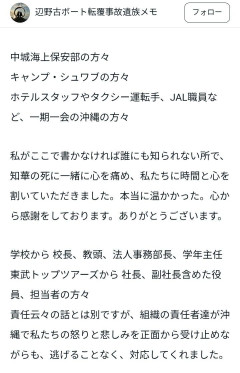 【辺野古】遺族「海保・在米軍・ホテル=心より感謝」「学校・旅行代理店=逃げることなく対応」「船関係者・反対協議会=謝罪・問合せ・手紙・弔電、一切なし」