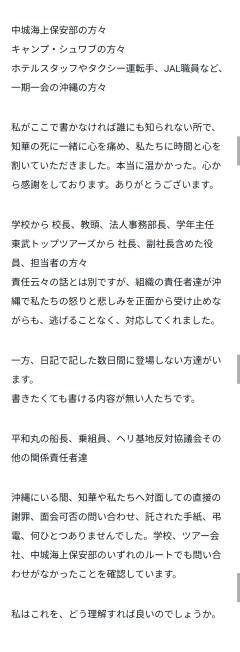 【辺野古】遺族「海保・在米軍・ホテル=心より感謝」「学校・旅行代理店=逃げることなく対応」「船関係者・反対協議会=謝罪・問合せ・手紙・弔電、一切なし」