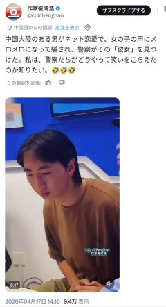 1: 2026/04/18(土) 10:00:40.95 中国内地一男子网恋,被女生声音迷倒而被骗,警察找到了他的“女朋友”,我想知道警察们是怎么忍住不笑的。🤣🤣🤣 pic.twitter.com/n9ByHWdr8u— 作家崔成浩 (@cuichenghao) April 17, 2026 ※関連記事 【動画】チー牛、授業中に死亡してしまう・・・・・…