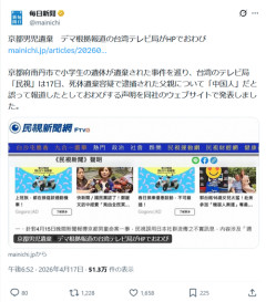1: 2026/04/18(土) 13:23:07.13 京都男児遺棄 デマ根拠報道の台湾テレビ局がHPでおわび京都府南丹市で小学生の遺体が遺棄された事件を巡り、台湾のテレビ局「民視」は17日、死体遺棄容疑で逮捕された父親について「中国人」だと誤って報道したとしておわびする声明を同社のウェブサイトで発表しました。— 毎日新聞 (@mainichi) April 17, 2026 ※関連記事 台湾のテレビ局・民視「京都男児死体遺棄で逮捕の養父は中国籍」と報道して謝罪「日本のSNSで流れていたデマ情報だった」…
