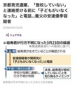 1: 2026/04/18(土) 12:15:32.95 ID:4K1UQES90 安達優季「息子がいなくなってしまったのですが!」(学校から連絡来る前) imgur.com/wRtCO0R 2: 2026/04/18(土) 12:16:11.55 ID:4K1UQES90 「ドラレコ 消し方」🔍 imgur.com/9sGeQxp 3: 2026/04/18(土) 12:16:32.51 ID:4K1UQES90 「死体 棄て方」🔍 imgur.com/xvoNm96…