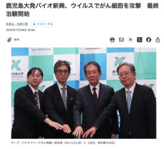 1: ななしさん@発達中 2026/04/17(金) 13:46:48.63 BE:257760348-2BP(4500)ID:HcLTB8x40 鹿児島大発バイオ新興、ウイルスでがん細胞を攻撃 最終治験開始 鹿児島大発スタートアップのサーブ・バイオファーマ(鹿児島市)と鹿児島大は26日、遺伝子改変ウイルスを使ったがん治療法について、最終段階の医師主導の臨床試験(治験)を始めたと発表した。がん細胞だけを攻撃するように遺伝子を改変したウイルスを使った治療法を開発し、国内で2027年の承認取得を目指す。 鹿児島大教授でサーブ創業者・会長の小戝(こさい)健一郎氏を研究開発代表者として、11月に医師主導治験を開始した。骨の希少がん「原発性悪性骨腫瘍」向けに開発し、12例の患者を対象に1年間実施する。何割の患者に効果があったか評価する。 サーブが開発するのは、がん細胞だけで増えるように工夫された遺伝子組み換えウイルスを使った治療法だ。正常組織を傷つけず、感染したがん細胞を死滅させる。 高市早苗政権は戦略投資する17分野に「創薬・先端医療」を指定した。小戝氏は「我々はイノベーションの生態系(エコシステム)などに貢献できていると思っている。国家的な重点政策実現に寄与していきたい」と述べた。 日本経済新聞 | 2025年11月26日 18:06…