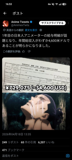 1: 2026/04/18(土) 16:55:17.66 A first-year Japanese animator’s pay stub has gone viral, revealing total annual earnings of just $4,600 USD. pic.twitter.com/SJRyGzwNDq— Anime Tweets (@AnimexTwts) April 18, 2026 ※関連記事 【悲報】Vtuberさん、ベテラン声優に物申したら大炎上してアニメーターに怒られる…