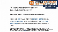 1: 名無し 2026/04/19(日) 07:37:42.15 ID:vK9L2wN0m 17日夜11時すぎ、遺族がSNSを更新。沖縄から自宅へ知華さんを連れて帰る道のりから、葬儀への準備をつづりました。 「日記で記した数日間に登場しない方達がいます。書きたくても書ける内容が無い人たちです。平和丸の船長、乗組員、ヘリ基地反対協議会、その他の関係責任者達、沖縄にいる間、知華や私たちへ対面しての直接の謝罪、面会可否の問い合わせ、託された手紙、弔電、何ひとつありませんでした。学校、ツアー会社、中城海上保安部のいずれのルートでも問い合わせがなかったことを確認しています。私はこれを、どう理解すれば良いのでしょうか」 テレ朝news ■要約 ・辺野古沖の船転覆事故から1カ月が経過し亡くなった女子生徒の遺族がSNSで現在の心境を公開 ・遺族は沖縄滞在中に平和丸の船長や反対協議会など関係責任者からの謝罪が一切なかったと明かす ・面会可否の問い合わせや手紙に弔電すら何ひとつ届いていない現状について不審と悲しみを吐露 ・学校やツアー会社などの窓口を通じた連絡も一切確認できていないとして団体側の対応を疑問視 ・亡くなった生徒の部屋の様子や多くの友人が参列した葬儀の様子を綴り癒えない深い悲しみが広がる 【速報】 FANZA10円祭りきたー!!!!急げwwww【第一弾】 なあ、東京一極集中って解決無理じゃない? 中国の老人、豆腐で「日本」を作って油で揚げてご満悦…