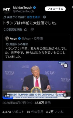 1: ネギ速の名無しさん 2026/04/19(日) 09:35:57.31 ID:tuAmPTwHr なおその1年前はトランプが大統領でした imgur.com/G8k0Wt4 2: ネギ速の名無しさん 2026/04/19(日) 09:37:23.23 ID:ONVtPAkl0 ・1年前はもうおまえが大統領やったろ・1年前より今の方が馬鹿にされてる二重の意味でおかしい 3: ネギ速の名無しさん 2026/04/19(日) 09:36:28.34 ID:osqPT4eP0 もうボケはじまってるやん…