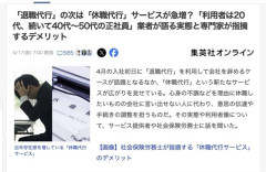 1 : 「退職代行」の次は「休職代行」サービスが急増?「利用者は20代、続いて40代~50代の正社員」業者が語る実態と専門家が指摘するデメリット 4月の入社初日に「退職代行」を利用して会社を辞めるケースが話題となるなか、「休職代行」という新たなサービスが広がりを見せている。心身の不調などを理由に休職したいものの会社に言い出せない人に代わり、意思の伝達や手続きの調整を担うものだ。その実態や利用者像について、サービス提供者や社会保険労務士に話を聞いた。 略 心身の不調などで休職したいと考えた際には、体調不良の中で診断書の手配や申請書の準備、会社とのやり取りを行なう必要があり、当人にとっては大きな負担となる可能性がある。 SNS上でも休職手続きの負担を訴える声が相次いでいる。 「休職手続きマジでしんどい」 「メンタル不調でしんどい中手続きをしないといけない事が億劫すぎて」 「病院や職場とのやり取りがしんど過ぎて復職せずに退職する人が多いのもわかる」 こうした中、「休職代行サービス」を行なっているのが「合同労働組合 私のユニオン」だ。その利用実態について担当者は次のように説明する。 「(利用者は)20代が中心で、その次に多いのは40代~50代です。雇用形態はほとんどが正社員です。サービスの利用者は徐々に増えております。 続きは↓…