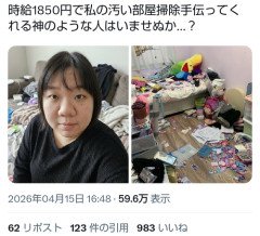1: 2026/04/19(日) 21:06:11.52 時給1850円で私の汚い部屋掃除手伝ってくれる神のような人はいませぬか...? pic.twitter.com/LQOQZRaFBR— 大城 友理奈 (@LaurenHaye60961) April 15, 2026 ※関連記事 【画像】女さん、自撮りの角度で汚部屋バレwwwwwwwwwww…