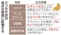 引用元: それでも動く名無し 2026/04/19(日) 01:03:39.59 ID:u/kIYyG70 ナフサ不足、意外な物資に余波 バナナ、アイス、チョコレート… 予防接種の注射器も 原油の供給不安は意外なものにも波及している。例えば、「物価の優等生」の一つであるバナナ。国内消費の99・9%が外国産で、害虫の侵入を防ぐため、まだ青い状態で輸入される。加工室にガスを充満させて黄色く熟成させた上で店頭に並べられるが、そのガスがナフサ由来のエチレンガスだ。 日本バナナ輸入組合の明石英次事務局長は「ナフサが不足すれば、出荷が困難になる」と危機感を募らせる。熟成の工程は輸入が多いキウイフルーツやアボカドにも共通しており、食卓への影響は避けられない。 市販のアイスクリームやチョコレートに使われるバニラフレーバーの原料であるバニリンも、ナフサ由来のベンゼンなどを基に化学合成されている。天然香料との価格差は大きく、安価な商品の供給に陰りが出そうだ。 医療の分野にも不安が広がる。はしか(麻疹)の感染者数が昨年同期の3倍超のペースで増加し、17日には日本ワクチン学会が子供へのワクチン接種を確実に行うように呼びかけた。 予防接種に使われているプラスチックの注射器も原料はナフサで、調達に支障が出ないか懸念される。医療用手袋、カテーテル、透析器具の調達にも不安が生じており、16日には、政府が備蓄の医療用手袋5千万枚を5月から放出すると表明した。(永礼もも香) 備蓄100日割ると不安拡大 小嶌正稔・桃山学院大教授(石油流通産業史) イランの石油施設は空爆によって甚大な被害を受けており、回復には時間を要す。米国とイランの和平合意が実現しても原油価格の高騰は1、2年続くと考えられる。 供給不足への不安が広がる一つの目安は、石油備蓄が100日分を割ることだ。資源エネルギー庁によると、日本の備蓄は221日分(13日時点)。状況が変わらなければ、年末にはこの数値に達する。パニック需要により流通各層で在庫の囲い込みが発生し、混乱が広がるだろう。 必要となるのは、石油利用の節約だ。ガソリンの利用を控えたり、プラスチック製品をリサイクルに回したりとできることは多い。こうした動きは長い目で見れば、脱石油につながり、中東依存からの脱却やエネルギーの安定供給をもたらす。石油に依存することは安全保障における大きなリスクとなる。暮らしを見返す契機として考えるべきだ。…