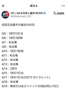 1: 名無し 2026/04/20(月) 16:18:58.371 ID:PsUb1DXdS .300 0本 5打点 OPS.862 2: 名無し 2026/04/20(月) 16:19:23.357 ID:RiKON4imK ようやっとる…