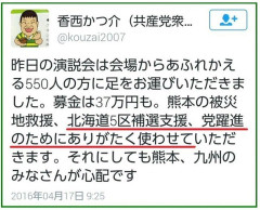1: 名無しさん@ 2026/04/20(月) 13:49:44.12 ID:NeZuNnQY0● BE:135853815-PLT(13000) 【カンパ!集金!デモ!】デモ開始前の挨拶で真っ先に集金を求めるColaboと連帯する活動家の菱山南帆子さん「とてつもなくお金が掛かっている!」「カンパ袋を持ったスタッフがいる」「カンパをしていただけたら」「お願いしまーす!」隣にいるのはうんこソングで有名な… pic.twitter.com/9bXRo24guQ— ホットケーキくん(ホッケチャンネル) (@hotcake_kun_) April 19, 2026 「とてつもなくお金が掛かっている!」 「カンパ袋を持ったスタッフがいる」 「カンパをしていただけたら」 「お願いしまーす!」 63: 名無しさん@ 2026/04/20(月) 14:13:08.53 ID:Dtl03P0z0 しんぶん赤旗 2026年4月18日 「赤旗」10億円募金は目標を達成しました 心からの感謝を申し上げます >>1 募金箱よく見たら「赤旗100万人読者回復・10億円募金」とか書いてね? 78: 名無しさん@ 2026/04/20(月) 14:21:51.19 ID:5O21Wztl0 >>1 どこか大きな会場借りて、音響、照明スタッフ雇うわけでもないのに? お金払って動員しているってこと? 2: 名無しさん@ 2026/04/20(月) 13:50:36.67 ID:0O63j2YU0 プロ雇うから 8: 名無しさん@ 2026/04/20(月) 13:52:16.21 ID:jFjXRhml0 嫌なこった😀 9: 名無しさん@ 2026/04/20(月) 13:52:33.38 ID:vJhuUMh10 動員に日当出したりするから 10: 名無しさん@ 2026/04/20(月) 13:53:44.09 ID:NMj3Z9Ka0 >>9 ほんそれ 11: 名無しさん@ 2026/04/20(月) 13:53:53.16 ID:78QB8St90 カンパと言えば😂 16: 名無しさん@ 2026/04/20(月) 13:56:08.94 ID:lxP891Kw0 何にお金がかかったんだい 29: 名無しさん@ 2026/04/20(月) 14:00:16.61 ID:LUWFSsJn0 いやなんにお金使ったの? 32: 名無しさん@ 2026/04/20(月) 14:01:49.13 ID:COstlPfa0 もしかして、デモってカンパしてくれるカモをおびき寄せてるだけなんじゃねえの? 33: 名無しさん@ 2026/04/20(月) 14:01:57.61 ID:QwZlnVRP0 何にかかっているんですか? 49: 名無しさん@ 2026/04/20(月) 14:09:35.90 ID:PAZI6YV40 勝手に集まってるのに費用はかからんやろ 動員でもしたん? 68: 名無しさん@ 2026/04/20(月) 14:16:06.57 ID:fCu0jVBE0 いくらかかるんだろ 金集めるなら公表してほしい 74: 名無しさん@ 2026/04/20(月) 14:18:46.61 ID:WkQziV+y0 また共産党か… 80: 名無しさん@ 2026/04/20(月) 14:23:00.51 ID:RxLqJq1O0 デモ隊に日当支払わなきゃ生活できないもんな 114: 名無しさん@ 2026/04/20(月) 15:06:03.55 ID:7J6+whXX0 何で金掛かるんだ? 117: 名無しさん@ 2026/04/20(月) 15:16:47.64 ID:W9hCKohZ0 >>114 お布施 引用元…