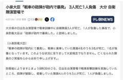 1 : 小泉大臣「戦車の砲弾が砲内で暴発」 3人死亡1人負傷 大分 自衛隊演習場で(テレビ朝日系(ANN)) - Yahoo!ニュース - 4/21(火) 13:52配信 テレビ朝日系(ANN) 大分県の日出生台演習場で戦車訓練中に自衛隊員3人が死亡、1人が負傷した事故で、小泉防衛大臣は「砲弾が砲内で暴発した」と説明しました。 (小泉防衛大臣) 「戦車の砲弾が砲内にて暴発し、戦車に乗車していた隊員4名のうち3名が死亡、1名が負傷となっています。このような状況に至りまして大変残念でなりません。亡くなられた隊員のご冥福を心からお祈り申し上げます。」 防衛省によりますときょう8時39分ごろ、日出生台演習場で戦車射撃訓練を実施していたところ、砲弾が破裂し、搭乗していた隊員4人のうち3人が死亡、1人が負傷しました。 小泉大臣は事故調査委員会を立ち上げ、原因などについて確認するとしています。…