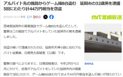 1: 2026/04/21(火) 12:52:53.15 ID:V2Ixawn90 宮崎県延岡市の商業施設でゲーム機8台を盗んだとして、警察はこの施設でアルバイトをしていた延岡市の男を逮捕しました。 窃盗の疑いで逮捕されたのは、延岡市天神小路に住むアルバイト従業員、日高亮太容疑者(32歳)です。 警察の調べによりますと、日高容疑者は、今年2月から3月にかけて、自身がアルバイトをしていた延岡市内の商業施設で5回にわたり、ゲーム機8台あわせておよそ44万円相当を盗んだ疑いが持たれています。 警察は、防犯カメラの映像や従業員への聞き込みから日高容疑者を特定し、21日、逮捕しました。 調べに対し、日高容疑者は、容疑を認めているということです。…