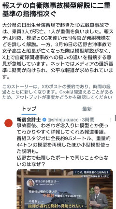 1: 名無しさん@ 2026/04/22(水) 09:40:04.84 ID:/CX4B+r70● BE:662593167-2BP(2000) 自衛隊員が死亡する事故が10式戦車の中で発生し、その戦車の模型を使って早速きめ細かい解説をする報道ステーション。辺野古沖転覆死亡事故から1ヶ月以上も経つが、事故を起こした抗議船の模型を使ったきめ細かい解説はいつやるんですか?いい加減待ちくたびれました。 pic.twitter.com/bB6uS1OH9x— ラッキー7 (@lucky_75757) April 21, 2026 自衛隊員が死亡する事故が10式戦車の中で発生し、その戦車の模型を使って早速きめ細かい解説をする報道ステーション。辺野古沖転覆死亡事故から1ヶ月以上も経つが、事故を起こした抗議船の模型を使ったきめ細かい解説はいつやるんですか?いい加減待ちくたびれました。 pic.twitter.com/bB6uS1OH9x— ラッキー7 (@lucky_75757) April 21, 2026 68: 名無しさん@ 2026/04/22(水) 10:58:53.27 ID:0SkybDpx0 >>1 まあタミヤ1/35抗議船なんてキットは今後も出ないからなあw しゃあない 70: 名無しさん@ 2026/04/22(水) 10:59:34.89 ID:zTlEd/an0 >>68 漁船の模型はそこそこあるので… 3: 名無しさん@ 2026/04/22(水) 09:41:18.70 ID:4lbD8Y3R0 辺野古は事故じゃなくて危険行為による故意の事件だろ 4: 名無しさん@ 2026/04/22(水) 09:41:40.60 ID:gMcPyvXQ0 自衛隊だから 6: 名無しさん@ 2026/04/22(水) 09:43:20.25 ID:00mpvHsh0 あの朝日のモデラーはまど在職してるのか? 47: 名無しさん@ 2026/04/22(水) 10:24:58.99 ID:BGc0d+Ax0 >>6 ディスプレイモデルの完成品でない? 7: 名無しさん@ 2026/04/22(水) 09:43:50.72 ID:nfz/+lwH0 辺野古関連ではNHKが今朝のニュースで 同志社に文科省が聞き取り程度の報道が やっと出た程度… ここまで来ると見苦しい限り 日本人の敵オールドメディア 9: 名無しさん@ 2026/04/22(水) 09:45:21.66 ID:TG0yeCY60 コメンテーター用意してねちねちするタイプのオールドメディア朝からうきうきでわろたわきも 13: 名無しさん@ 2026/04/22(水) 09:50:26.36 ID:IzWWscUw0 わかりやすいwww 24: 名無しさん@ 2026/04/22(水) 09:57:54.96 ID:2+0cIGUZ0 報道しない自由ステーション 26: 名無しさん@ 2026/04/22(水) 10:00:59.86 ID:1PFxbH+40 報ステとか10年以上見てないな 28: 名無しさん@ 2026/04/22(水) 10:02:28.00 ID:RnDCdR5b0 ホンマわかりやすいな 30: 名無しさん@ 2026/04/22(水) 10:05:53.89 ID:6fV1W67w0 事故から数時間で用意するとか凄まじい熱意だな 56: 名無しさん@ 2026/04/22(水) 10:34:49.32 ID:pqkPy3xd0 あんな貧乏臭い船 模型化する身にもなってみろ 90: 名無しさん@ 2026/04/22(水) 11:28:13.89 ID:Uusx5oX00 ワイドスクランブルは戦車の砲弾の模型まで出してきたぞ 辺野古の抗議船の模型も作れよwwww 91: 名無しさん@ 2026/04/22(水) 11:28:41.83 ID:WkQSZ0Zo0 これ見てて問題なると思ったわ、辺野古と扱い方が違いすぎる 99: 名無しさん@ 2026/04/22(水) 11:35:20.76 ID:a1+maZdc0 模型まで作るとか気合入ってるな! 100: 名無しさん@ 2026/04/22(水) 11:35:50.37 ID:EmTfegbY0 ガレージキットで抗議船の模型を出せ 128: 名無しさん@ 2026/04/22(水) 11:55:27.44 ID:qKOvJr5f0 遺族すら誹謗中傷する パ「辺野古遺族は権力寄り 遺族は事故を政治利用するな!」(※リプライ禁止w) 194: 名無しさん@ 2026/04/22(水) 13:00:50.28 ID:pyRZxg1w0 不屈のプラモぐらいテレ朝に飾ってあるだろ 引用元…