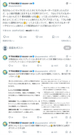 1: 2026/04/22(水) 12:53:41.40 先日カレシとマックに行ったときにモバイルオーダーで注文したんだけど、レジ前が普通に注文する人で行列できていて、「なんでモバイルオーダーしないんだろ?…— すずめの婚活💙𝕊𝔼𝔸𝕊𝕆ℕ𝕊4 (@suzumenohini) April 20, 2026 ※関連記事 【画像】この漫画の「ダメ人間」と付き合っている彼女の話、少し怖くて草wwwww…