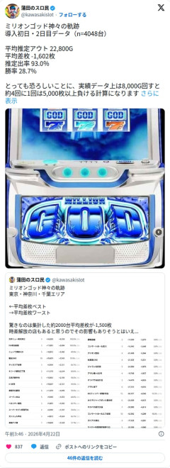 【悲報】ミリオンゴッド新台さん、導入初日のデータが絶望的すぎてしまう