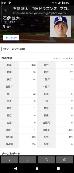 石伊雄太(捕).378 1本 6打点 OPS.989