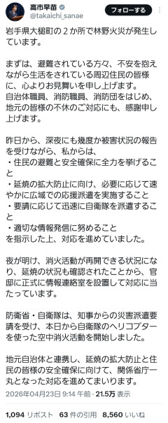 高市早苗さん、岩手の火事についてなぜかX更新