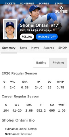 大谷翔平 2勝0敗 防御率0.38 24回 25奪三振 WHIP0.75