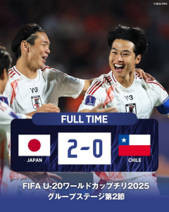 1: 名無し@サカサカ10 2025/10/01(水) 10:20:28.40 U-20日本代表はワールドカップグループステージ第2節で開催国のU-20チリ代表と対戦した。 初戦のエジプト戦を2-0と制した日本。前節からスタメン2人を変更し、MF平賀大空とFW高岡伶颯が今大会初スタメンを飾っている。小杉啓太や主将の市原吏音、佐藤龍之介は引き続き先発入りした。 7分にコーナーキックから最初のシュートを放った日本。19分には佐藤の意表を突いたFKを受けた小杉がゴール左から左足を振り抜く。際どいシュートとなったが、惜しくもゴール右へそれていった。 31分には右からのクロスに合わせようとした高岡がエリア内で倒されてPKを獲得。チリのリクエストによってVARとなるも判定は変わらず、日本が決定機を迎えた。キッカーの高岡はゴール右を狙うも、GKにストップされて先制点は生まれない。 チリがセットプレーからやや押し込みチャンスを作りながら、前半をスコアレスで終えた。後半から平賀に代わって石井久継が入った。51分には齋藤俊輔の仕掛けからエリア内で倒され日本がVARをリクエスト。PK判定となり、日本に2度目のチャンスが訪れる。主将の市川が冷静に正面にパネンカを沈め、2試合連続ゴールを挙げた。 62分にも決定機。小杉からの折り返しに高岡が合わせるが、GKのセーブに遭って追加点は生まれない。68分には小倉幸成と神田奏真が交代でピッチに入った。日本はこの時間帯自陣でのミスが目立ち、チリに押し込まれる展開が続く。 79分に交代で入った横山夢樹が大仕事。82分、ゴール中央で拾った横山が右足一閃。強烈なシュートがゴール左隅に吸い込まれ、日本が大きな追加点を挙げた。 最後まで出足の鋭さを見せ続けた日本が2-0と勝利。連勝でグループステージ突破を決めた。…