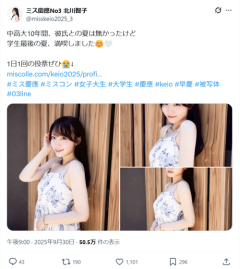 1: 2025/10/02(木) 00:18:44.53 中高大10年間、彼氏との夏は無かったけど学生最後の夏、満喫しました☺️🤍1日1回の投票ぜひ😭↓ミス慶應 #ミスコン #女子大生 #大学生 #慶應 #keio #早慶 #被写体 #03line pic.twitter.com/L6IAxQesrw— ミス慶應No3 北川智子 (@misskeio2025_3) September 30, 2025 ちなみに、クリスマスも、ディズニーとかも無いです🫠嘘だと思われてるので、記憶ある方、立候補ぜひ(誰も居ない) — ミス慶應No3 北川智子 (@misskeio2025_3) September 30, 2025 沢山見て頂いてた動画のリクエスト版作ってみた💖まだ声聞いた事ない方、想像通りでしたか💭😖↓ #ビリギャル #ミス慶應 #ミスコン #女子大生 #慶應 #大学受験 pic.twitter.com/QXdt8O25ut— ミス慶應No3 北川智子 (@misskeio2025_3) August 4, 2025 ↑ 2枚目右下に書いてあること ・学校でお昼時間もほぼ友達と話さない ・受験勉強に捧げて3年間で放課後遊んだの5回以下 ・目が覚めたら天井に絶対合格 ・お風呂の時間減らすために髪をボブに ・携帯を家に置いてく 5分間しか使わない ・電車でも歩いてても単語 二宮金次郎マインド ※関連記事 ミス慶應、「たった一つの投稿」でチー牛弱男の心をへし折る…