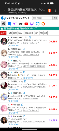 引用元: 251: Vtuberまとめ2025/10/02(木) 23:47:50.88 ホロライブ、嘘だと言ってくれ 257: Vtuberまとめ2025/10/02(木) 23:48:07.71 >>251 うわあああああああ 275: Vtuberまとめ2025/10/02(木) 23:49:26.08 >>251 栄冠で3万すら出せないこよりが悪い りりかですら出るのに 287: Vtuberまとめ2025/10/02(木) 23:50:05.18 >>251 スバルは今日はクソゲーだからしゃーない こよりは元々の数字を考えたら頑張ってる方 こうなった原因はぺこらだな 305: Vtuberまとめ2025/10/02(木) 23:50:42.59 >>251 ぺこらよっわ! 455: Vtuberまとめ2025/10/02(木) 23:57:05.23 >>251 葛葉ってオワコンなんだな 470: Vtuberまとめ2025/10/02(木) 23:58:11.72 >>455 あっちも代替わりか 1位の奴新人か? 540: Vtuberまとめ2025/10/03(金) 00:01:20.72 >>455 カセンによってlolとff14に封印されてる…