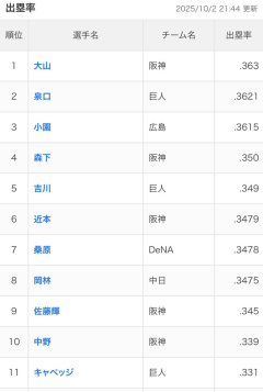 阪神大山、青柳からの3打席連続フォアボールで最高出塁率に王手