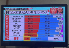 1:muffin ★ 2025/10/02(木) 21:02:38.43 ID:Y89CZJ2J9 TBS系バラエティー番組 「水曜日のダウンタウン」(午後10時)が1日、放送された。今放送は「みんなの説SP」で「日本が世界最下位のランキングある説」を立証した。 まず番組は日本が世界一を誇るカテゴリーだった「平均寿命」「平均IQ」「病院数」「100年以上続く企業の数」「世界でもっとも魅力的な国」を紹介。そんな中、日本が世界最下位だったランキングとして「国のために戦える人の割合」を紹介。世界価値観調査(2017年~20年、79カ国調査)によると、最下位となる79位は日本だった。「もし戦争が起こったら、国のために戦いますか?」との問いに「はい」と答える人の比率が問われたという。日本は「はい」と答えた人の比率が13・2%で最下位。参考に「いいえ」は48・6%、「分からない」は38・1%だった。 78位のリトアニアの「はい」が32・8%だった。逆に1位はベトナムの96・4%だった…続きはソース元で 思わずキャプってしまった。『水曜日のダウンタウンより』「国のために戦える人の割合ランキング」さんざんオールドメディアが自国をバカにした結果とも言える。 pic.twitter.com/sKXWekAnRX— Yuji TANAKA (@ugtk) October 1, 2025…