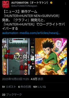 名前:ねいろ速報ハンターハンターってゲーム化には向かない気がする【ニュース】新作ゲーム『HUNTER×HUNTER NEN×SURVIVOR』発表。『クラフィ』開発元と、「HUNTER×HUNTER」でローグライトサバイバーする pic.twitter.com/kLJb9zBD5c— AUTOMATON(オートマトン) (@AUTOMATONJapan) October 3, 2025 名前:ねいろ速報 1能力がハッキリしてないキャラも少なくないしな名前:ねいろ速報 2あの格ゲーどうなったんだよ…