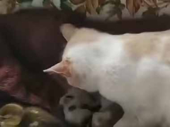 子育て中の母猫さん。 こらっ! 外に出ちゃダメにゃ! アヒルの子にこんな感じ……