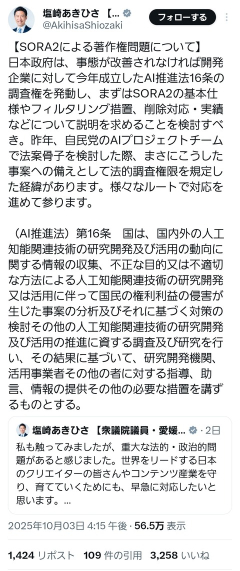 1:それでも動く名無し:2025/10/03(金) 22:28:19.98 ID:wBBvkgDa0 2:それでも動く名無し:2025/10/03(金) 22:29:15.03 ID:46b/Tisj0 これはしゃーないと思う 4:それでも動く名無し:2025/10/03(金) 22:30:04.83 ID:rNERQmQx0 日本の作品だけ生成し放題なの草 ディズニー様には逆らえませんってか…