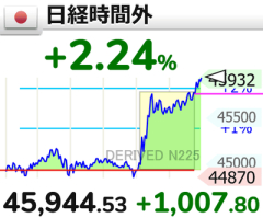 1: 名無し 2025/10/03(金) 11:15:36.67 ID:eCD9FXim0● BE:837857943-PLT(17930) 【市況】日経平均の上げ幅が800円突破 日経平均株価の上げ幅が800円を突破。10時19分現在、803.75円高の4万5740.48円まで上昇している。 日経平均 国内市況 リアルタイム チャート 【知らなかった速報】陸上自衛隊 第15旅団(先月、「エイサーに出るな」と市民団体に抗議された人達)、沖縄 国頭村の林野火災に伴う災害派遣、人員延... 【驚愕】 嫁のピルを違う薬に変えたらwwwwwwwwww 「水ダウ」が紹介「もし戦争が起こったら国のために戦いますか?」ランキングで日本は世界最下位!…