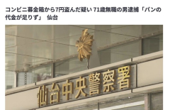 1 : 2日、仙台市青葉区のコンビニエンスストアで現金7円を盗んだとして無職の男が逮捕されました。 窃盗の疑いで逮捕されたのは、住所不定の71歳の無職の男です。警察によりますと男は、2日午前4時半頃、仙台市青葉区内のコンビニエンスストアで、募金箱から現金7円を盗んだ疑いが持たれています。約100円のパンを購入しようとしたところ金が数円足りず「足りない分に充てようとした」などと容疑を認めているということです。募金箱には、盗まれた7円以外にも現金が入っていたということです。 2 : せこいだけだろこれ 8 : またお前らか いい加減にしる…